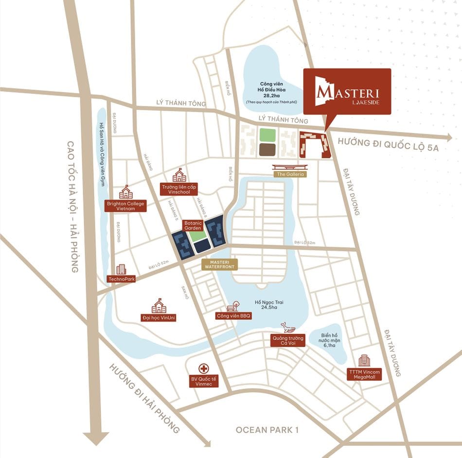 Toạ lạc trên điểm giao của đường Lý Thánh Tông và Đại Tây Dương, từ Masteri Lakeside cư dân có thể dễ dàng kết nối tới toàn Ocean City, trung tâm Thủ đô và các vùng kinh tế trọng điểm Bắc Bộ với hạ tầng giao thông đường bộ hiện đại vượt bậc.