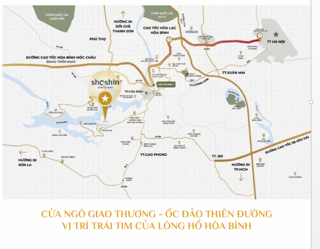 Shoshin Bình Thanh – Với vị trí đắc địa “tựa sơn hướng thủy” mang đến tài lộc, thịnh vượng. Tọa lạc giữa vùng non nước Hòa Bình thơ mộng, với 10.000 ha mặt nước và 3 tầng xanh gần gũi thiên nhiên.
